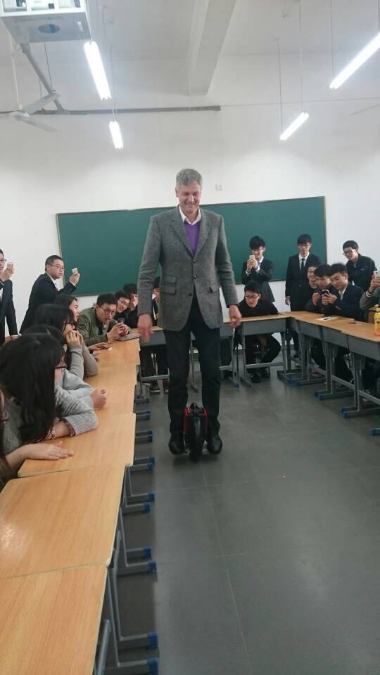 的一个学生手中买得的,十分喜欢,甚至随身携带到了这里。兴之所至,他为大家展示了怎么使用代步车,赢得同学们的阵阵喝彩。