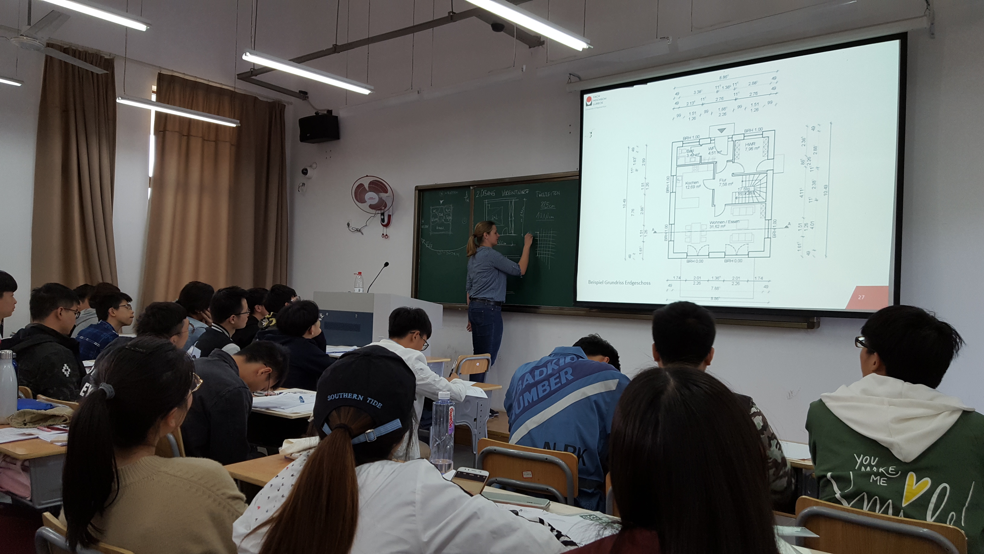 2018年4月9日,来自德国吕贝克应用科技大学的助教Jan Osten与Wiebke Martensen,为成人视频 土木工程专业2016级学生讲授为期一周的建筑构造补充课程。在一周时间内,两位教师充分安排时间进行课程设计教学,以德国普通家庭住宅为例,从最基本的气泡图开始进行设计,逐步将学生心中想象的住宅实现为实际建筑施工图。