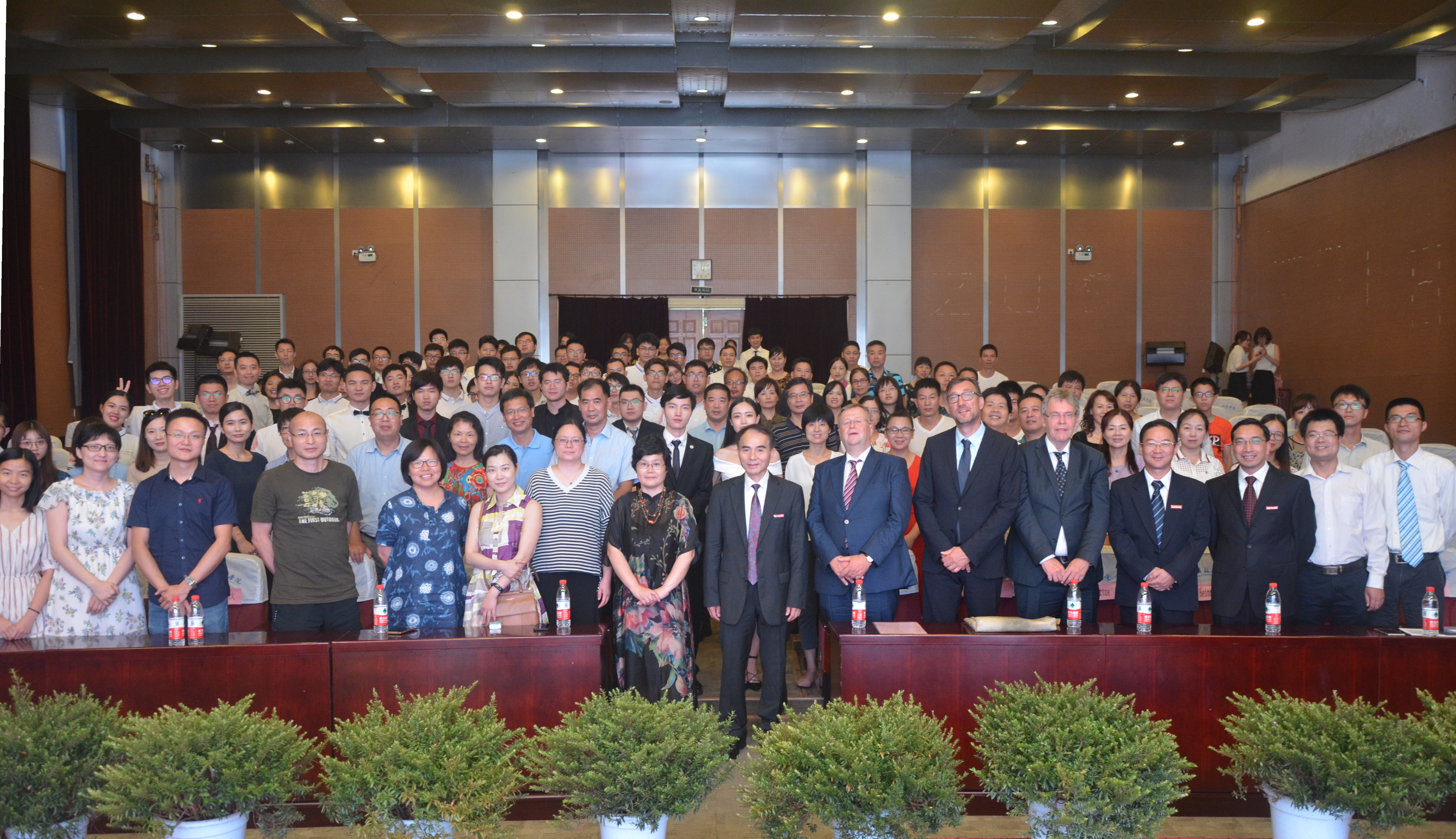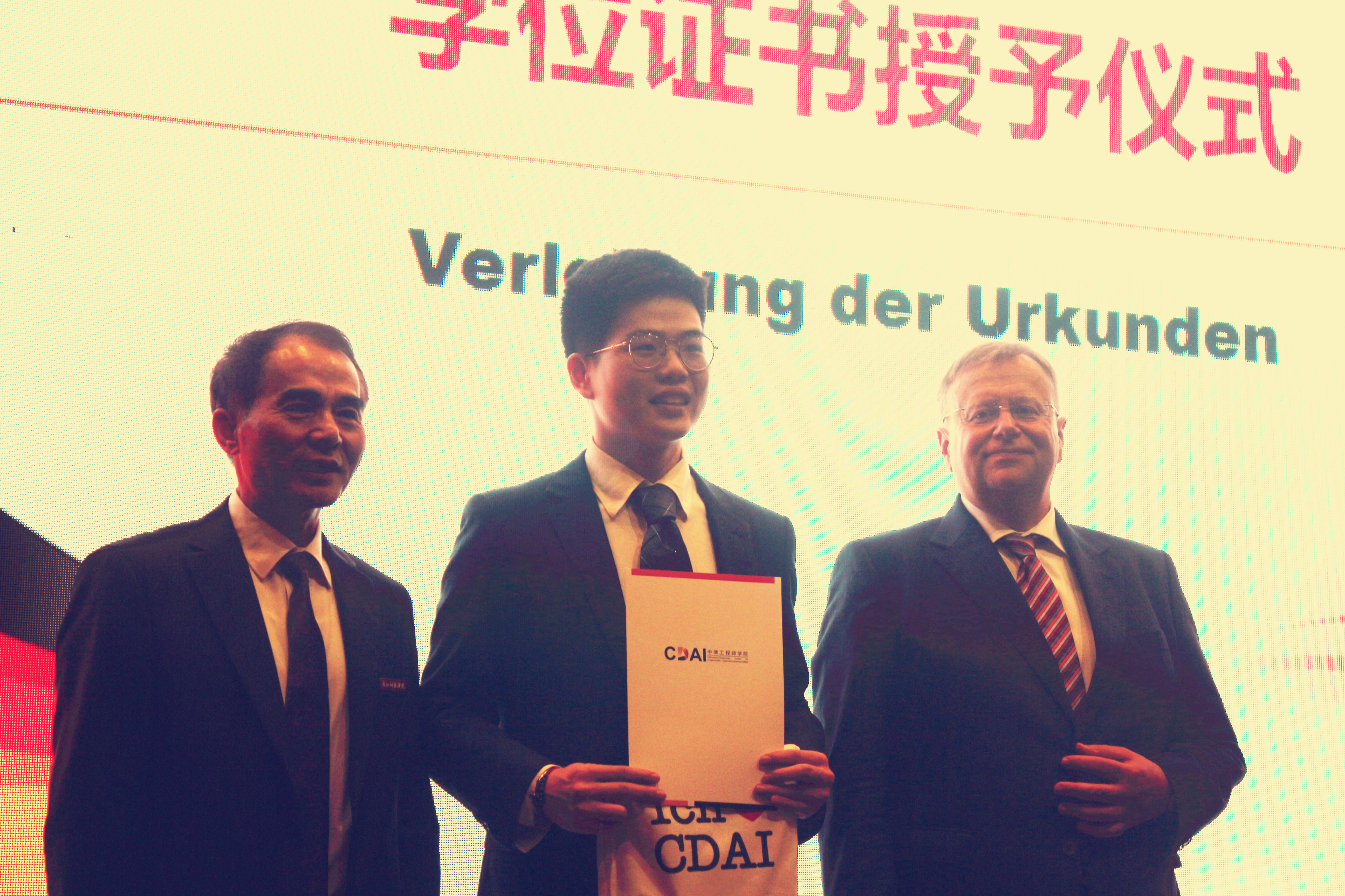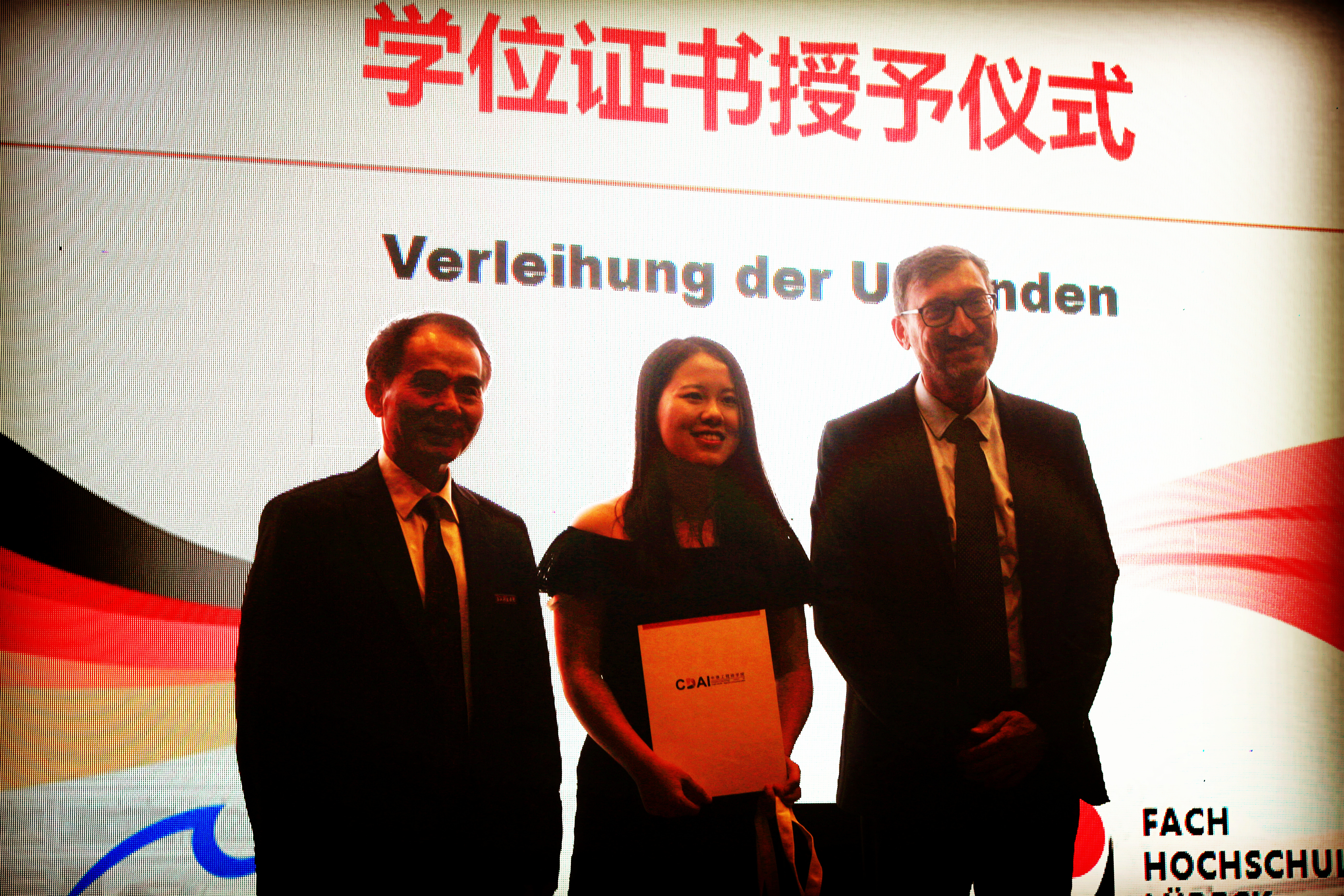 三方校领导为每一位毕业生颁发了毕业证书及学位证书并合影留念。校长叶高翔代表浙江科技成人视频 向圆满完成学业的毕业生表示了祝贺,他希望同学们有理想,有抱负,有国际视野,把个人远大的目标与本职工作结合起来,与人类的未来结合起来,为了中德两国的友谊和未来、为了人类文明的进步事业而不懈努力。两位德方校长也对毕业生们表示了祝贺,并希望融合了中德两国高等教育优势的同学们可以重新出发,为中德两国的经济发展和友好合作做出积极贡献。