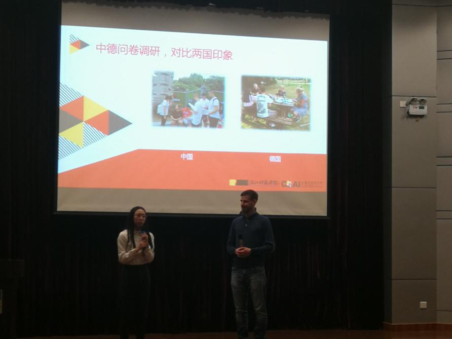 大会上,成人视频 代表吴双同学通过“参观主题学习,增强党性修养”、“德国名企参观,感受科技力量”以及“多地街头参访,一窥中德合作”三个方面,向大家详细介绍了这次以“与改革同行,与世界同步”为主题的暑期社会实践活动。从观看《厉害了我的国》感受中国崛起的热泪盈眶,到参观浙江美术馆学习改革开放背景下敢为人先的时代精神,再到赴井冈山革命博物馆了解革命老区人民艰苦奋斗的历程,Verbreiter团队成员们通过观展、看视频,提高党性修养。在德国吕贝克,团队成员参观了德国石荷州“H+H”公司、“Dräge”公司。干净的车间,现代化的生产及科学的管理,成员们近距离感受到科技的魅力和德国工业4.0的先进。同时团队精心准备了中德两个版本的调查问卷,分别在杭州与德国海德进行发放。共回收有效问卷73份。通过数据对比分析对于中德两国人民在产品、技术和国家战略的认识方面有了更直观的了解。