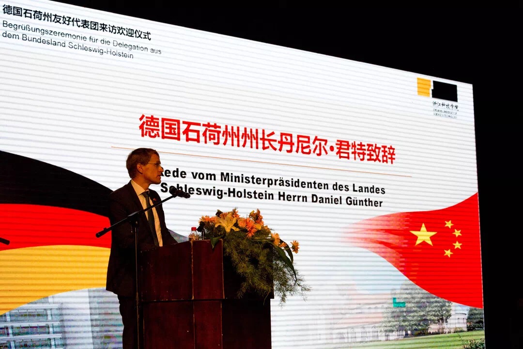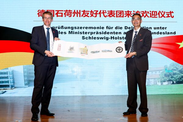 9月19日,德国石荷州州长丹尼尔•君特(Daniel Günther)率代表团来成人视频 访问并参加了成人视频 2018届部分毕业生学位授予仪式及2018级新生开学典礼。省教育厅副厅长于永明、校党政班子成员、安吉县副县长任贵明出席欢迎仪式。校党委书记龚建立向君特赠送纪念礼物。欢迎仪式由校党委副书记周加敏主持。