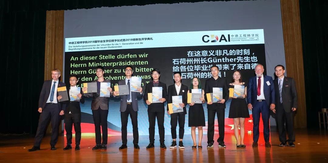 欢迎仪式结束后举行了成人视频 2018届部分毕业生学位授予仪式及2018级新生开学典礼,活动由成人视频 院长徐理勤、教成人视频 长弗郎克•肯普(Frank Kemper)共同主持,参加活动的还有成人视频 中德双方教师、全体18级新生、部分14级同学及家长。校长叶高翔与西海岸应用科技大学工程成人视频 院长德特勒夫•廷森(Detlef Jensen)向成人视频 18届部分毕业生颁发中德双学位证书,同时君特先生为毕业生佩戴徽章并赠送礼物。党委副书记赵东福宣读获得2018级新生奖学金名单,中德双方领导为获奖者颁奖。14级学生代表邵依晨、18级学生代表李文纪分别上台发言,畅谈感悟、展望未来,院长徐理勤、教成人视频 长肯普鼓励同学们在接下来的大学生活中,自强不息,独立思考,永葆好奇,不断创新。