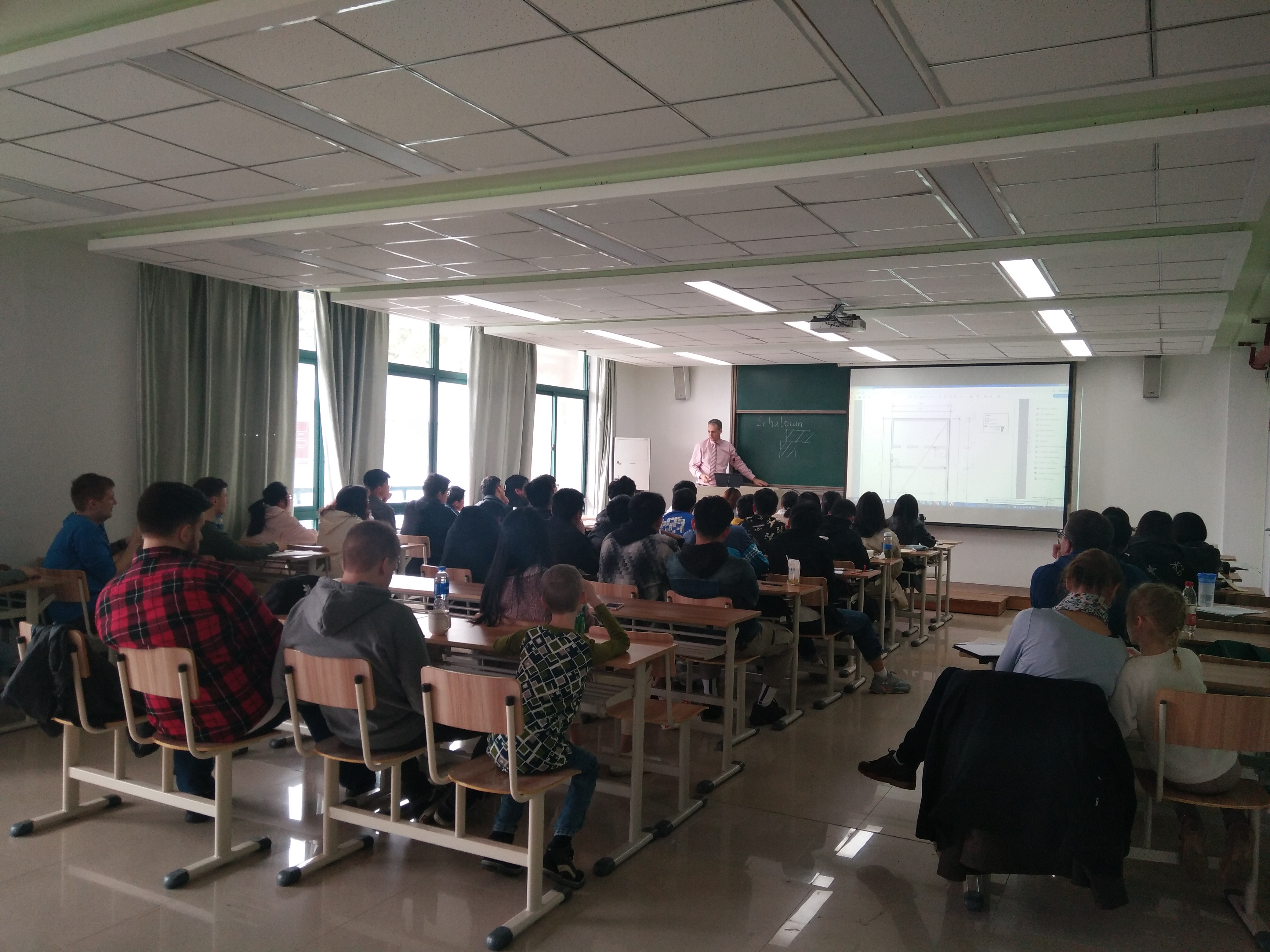 来访期间,德方代表团为成人视频 土木工程专业16级学生进行承载结构设计的集中辅导课,指导中方学生计算并画出相应的结构图、模板图和配筋图。通过五天的辅导课学习,中方学生进一步了解德国授课的模式和方法,也增进了与德国学生之间的交流。此外,比约恩·埃尔舍教授(Prof. Björn Elsche)、娜迪娜·埃尔舍研究员还为成人视频 土木工程专业16级学生进行出国选拔考试,共有3名学生成功入选。