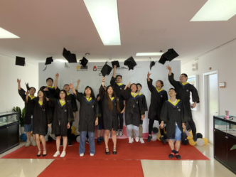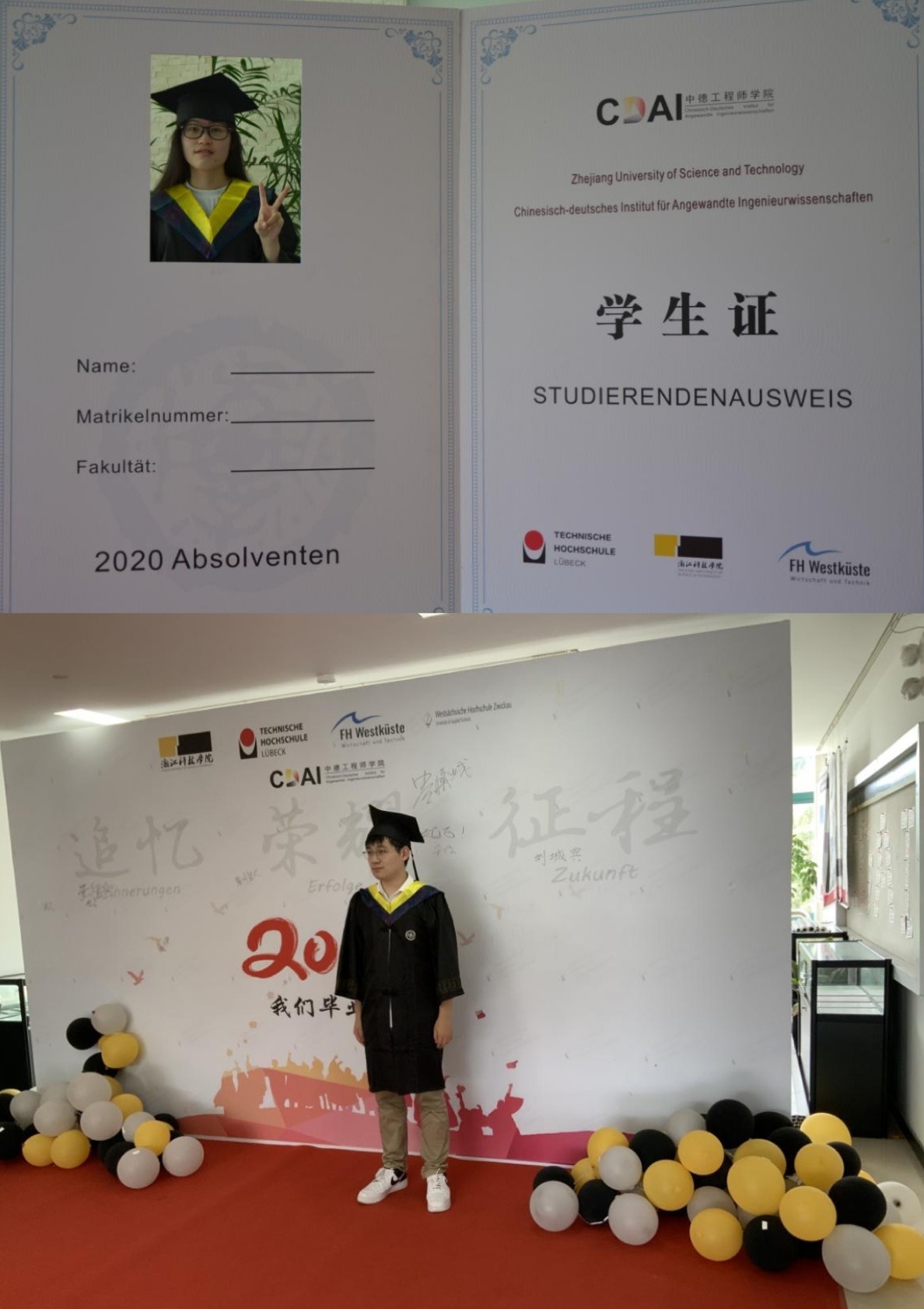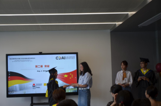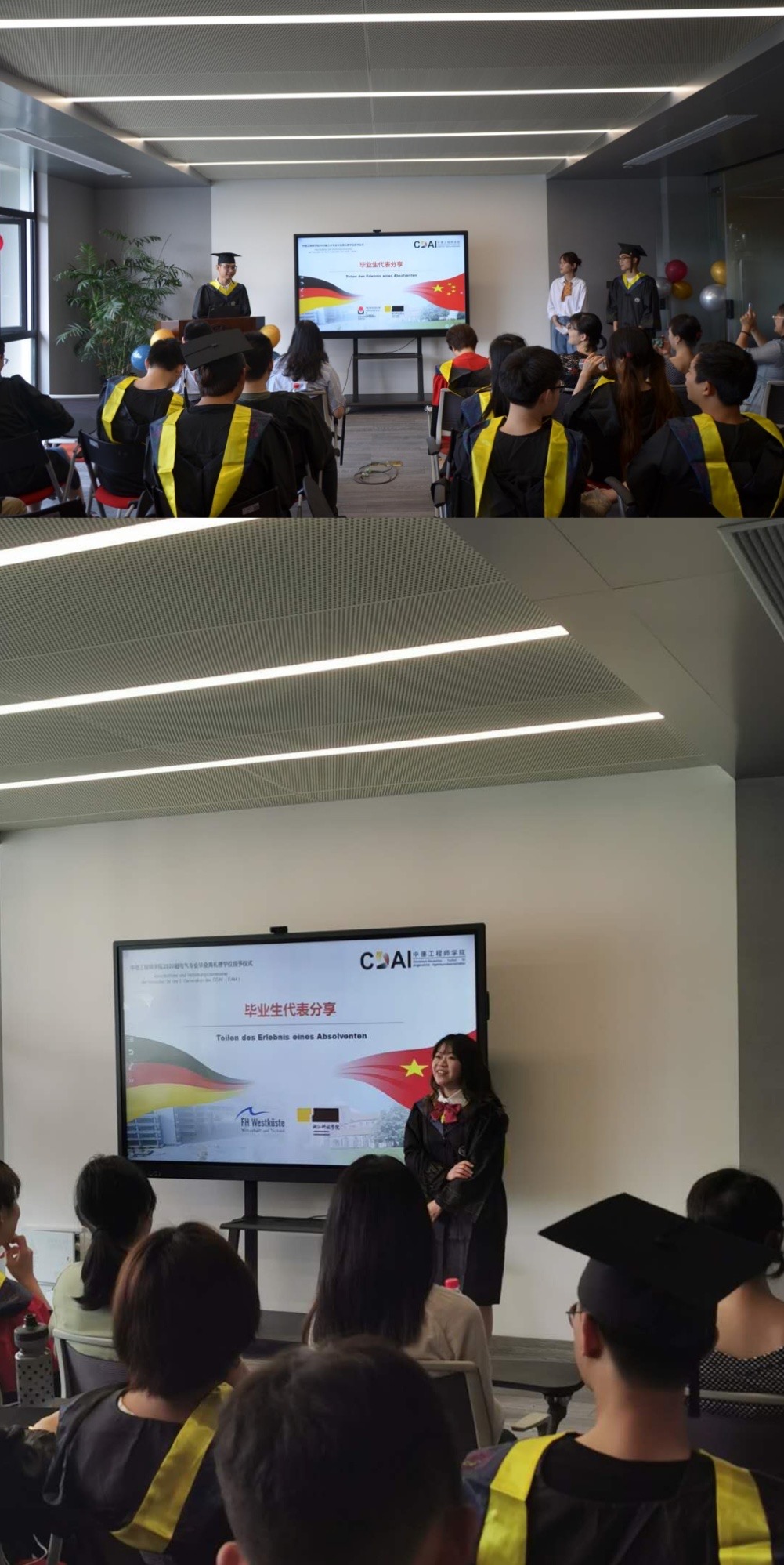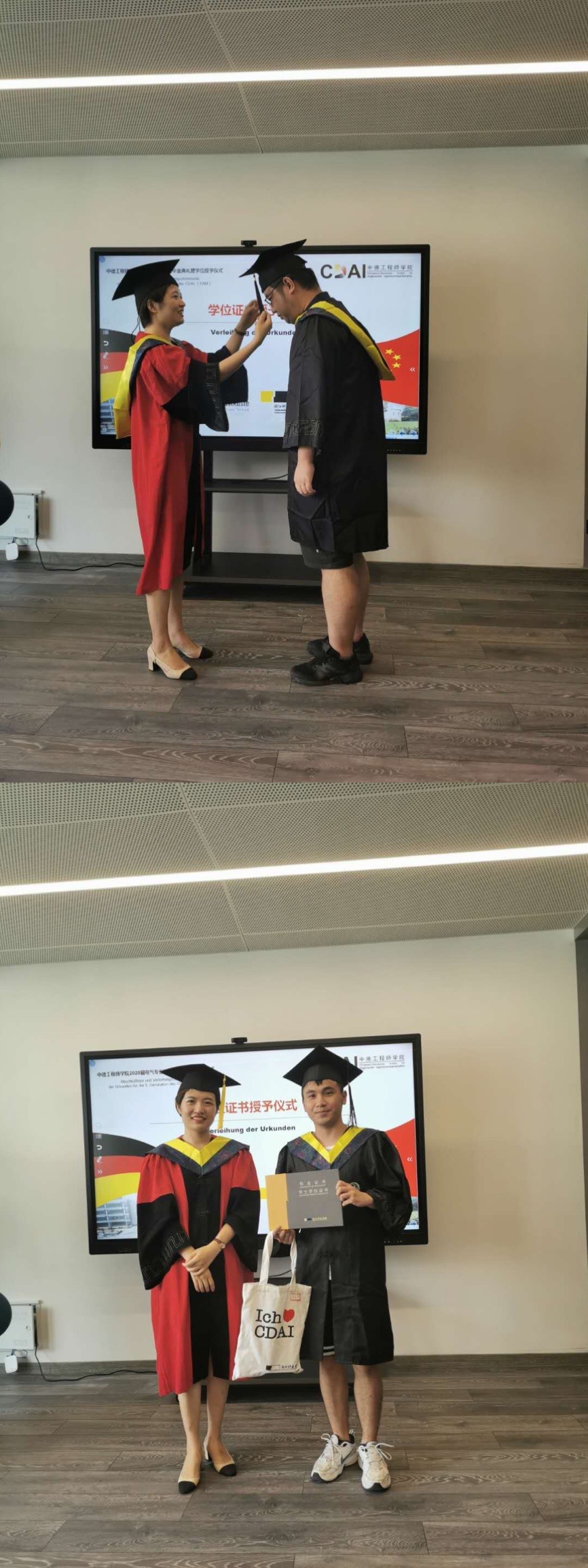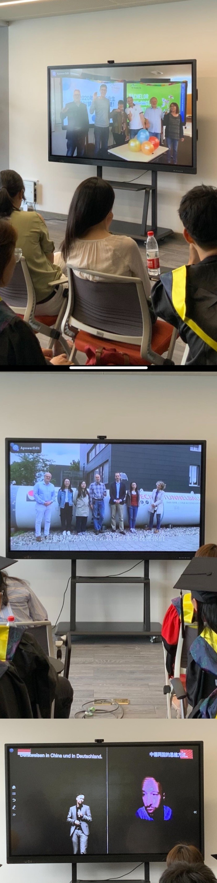 毕业典礼共三个篇章,分别为“追忆”、“荣耀”和“征程”。毕业代表们分享了个人最难忘的故事,回忆大学时期的点滴。范佳静副书记为优秀毕业生代表颁发证书和为校友联络员颁发聘书。薛文副院长身着导师服为学子们拨穗并颁发毕业证书和学位证书、校训纪念章和成人视频 纪念品。由于疫情关系,两所合作院校的德方教师没能来到现场,但他们也通过视频向毕业生们发来了诚挚的祝福。学工负责人李成炜副书记为大家带来了最后一堂课,他回顾了四年期间的学生活动,职业规划和出国交流几个方面,从近期毕业至长期发展向同学们提出了期许。最后薛文副院长总结发言,她结合自身情况,鼓励大家离校后多学本领、长才干,用更大的正能量走好未来每一步。