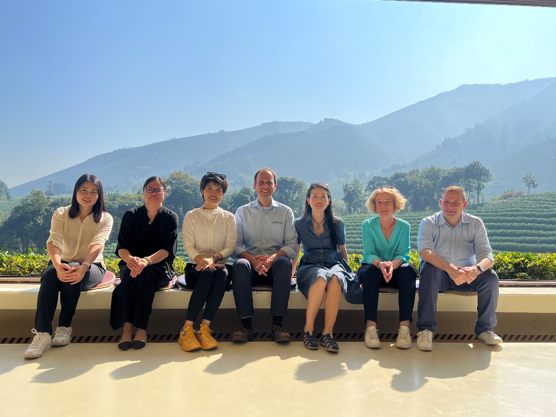 2023年11月5日,成人视频 院长薛文、直属党支部书记范佳静、土木专业教师金韶霞陪同来自德国吕贝克应用科技大学成人视频 德国办公室主任Nicola Graessner女士、土木工程专业德方负责人Jan Lüking教授、彭岚女士、德国茨维考应用科技大学工业工程专业Dirk Förster-Trallo教授等合作方同事,共赴安吉溪龙黄杜金叶子景区体验安吉白茶文化。