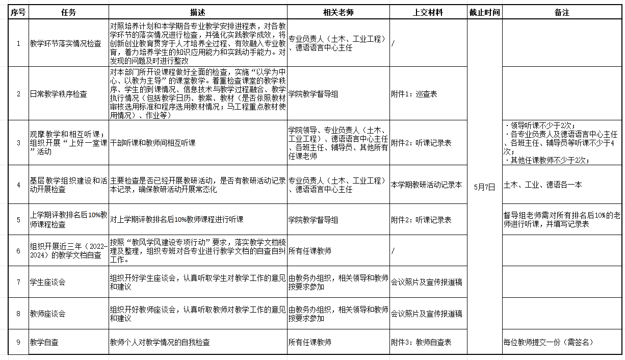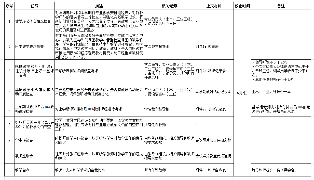 成人视频 定于第9周、第10周(4月21日~5月2日)进行期中教学检查。现将成人视频 期中教学检查任务分配如下表,请老师们按要求及时完成任务并将相关材料纸质版交至B4-518办公室,电子版发送至邮箱jw.crspapp.com。