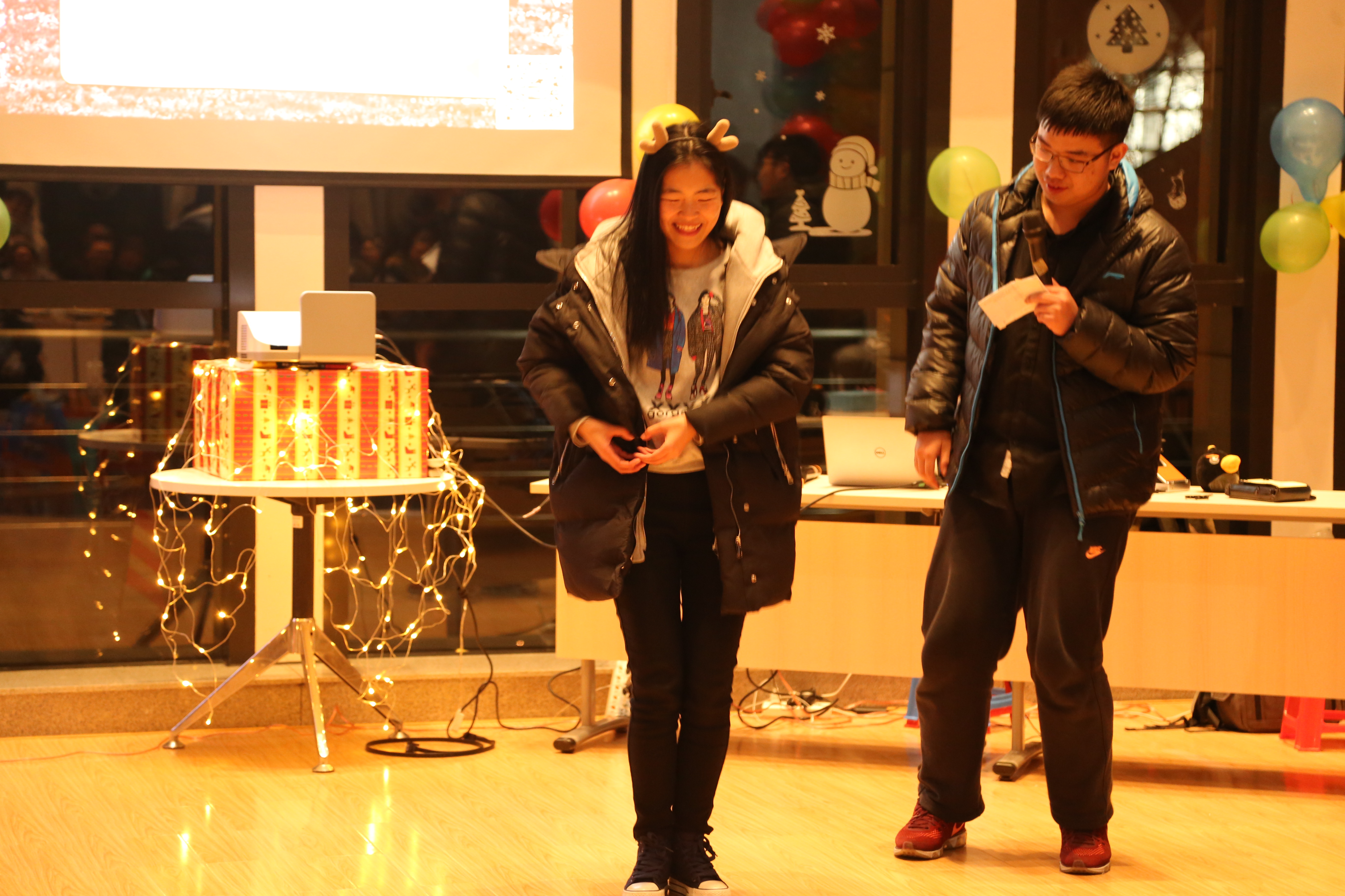 晚会开始前,同学们在礼物墙上抽取写着祝福的贺卡,然后把自己精心准备的礼物送给对方。伴随着收到礼物的笑容,晚会正式开始。我们有机智有趣的主持人、动听的德语歌曲、来自小和山的德语短剧、以及帅气的舞姿、好玩的游戏等,师生互动,同学们全都沉浸在欢乐的气氛中。晚会最后,三层蛋糕不仅为晚会的完美落幕画下句号,还为童馨莹和潘浩楠同学一起庆祝了生日,相信也是特别难忘的生日。