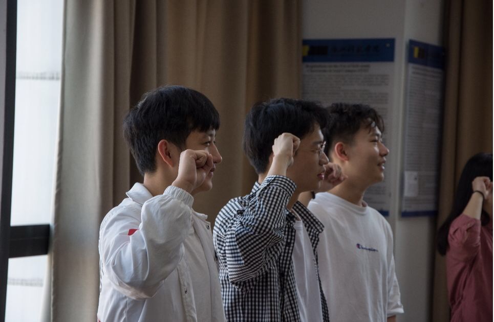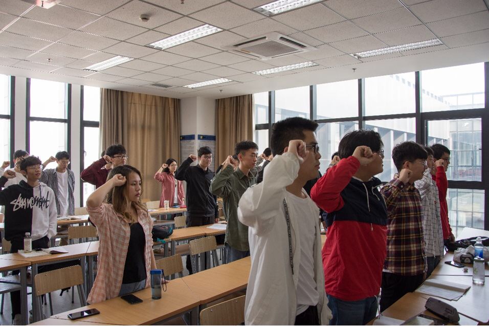 班长吴逸洋主持本次宣誓仪式,带领全班同学针对校德校训,日常学习,诚信做人,思考创新,自我修养五个方面进行探讨,制定目标,并集体宣誓。
