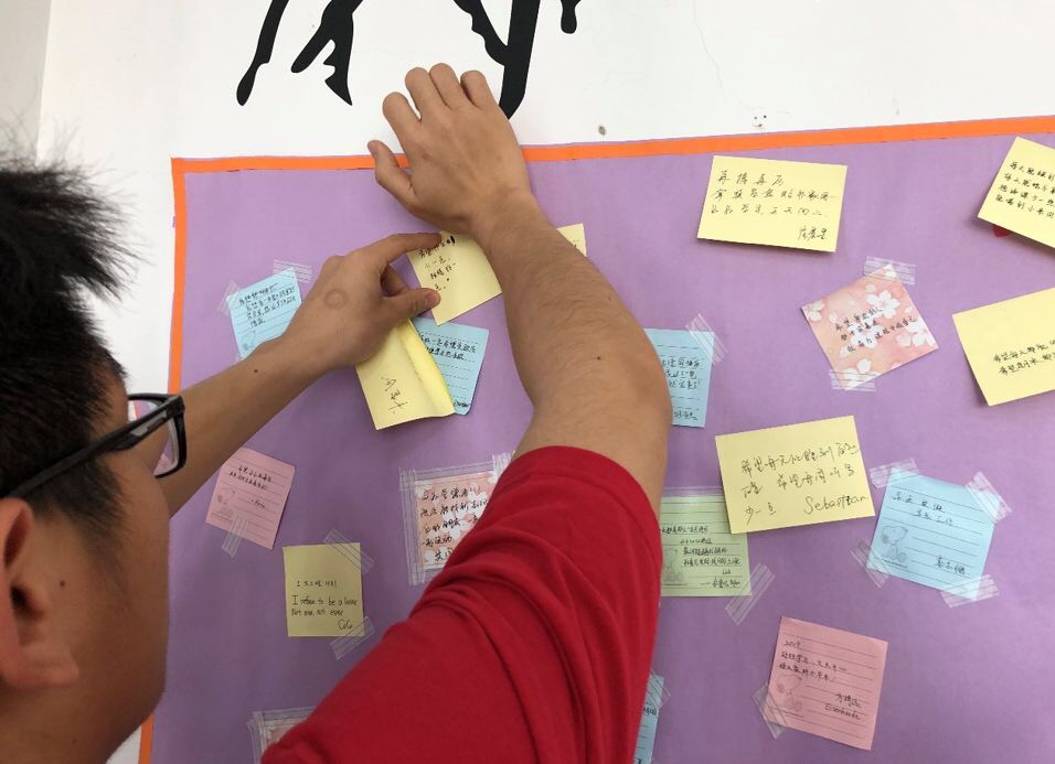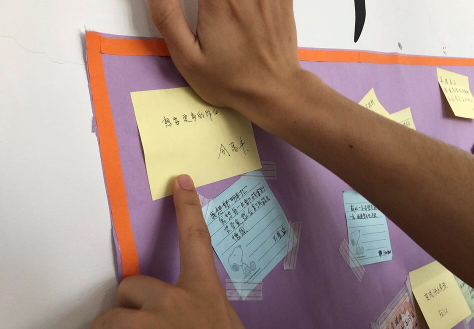 每人发了一张纸条,在上面填写本学期的目标或心愿,贴到崔晨星同学为大家准备的班级心愿墙上,以此来激励同学们奋发学习的决心,并希望通过“心愿墙”培养同学们自我督促的意识。