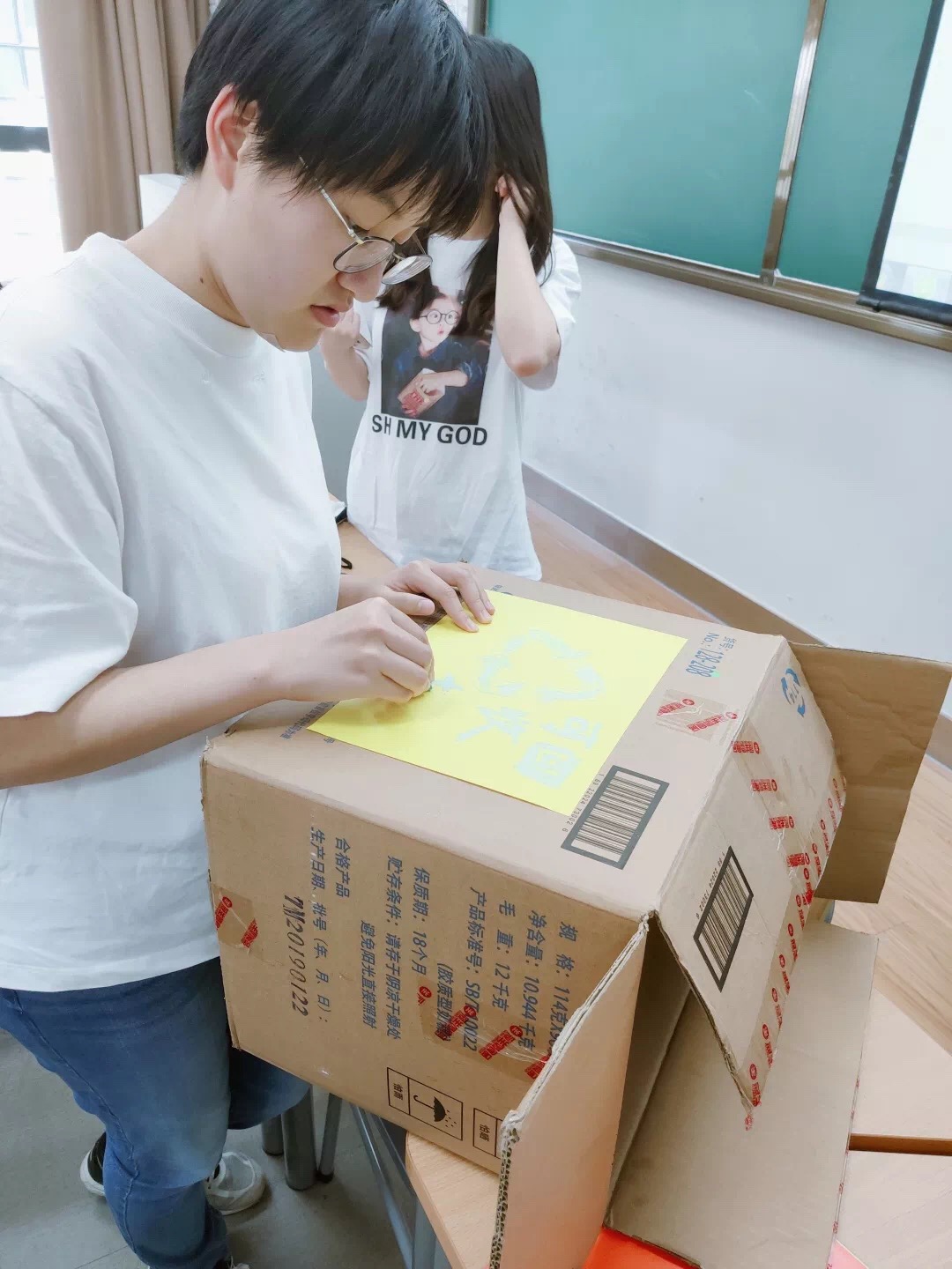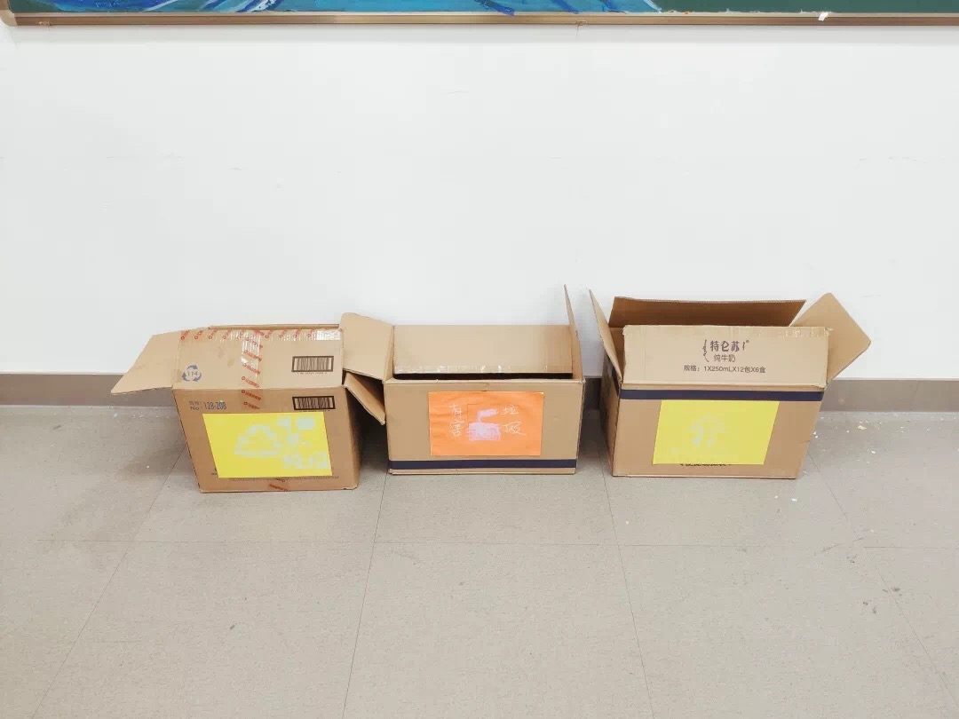 支部同学从超市获取废纸箱,亲手制作分类标识并将之粘贴于纸箱之上。并将这三个带有可回收、不可回收、有害垃圾标识的纸箱置于教室内。