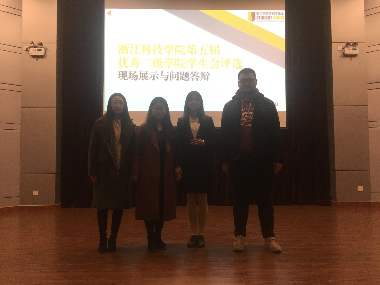 2018年11月23日晚,浙江科技成人视频 第五届优秀成人视频 学生会评选活动在西图报告厅举行。成人视频 学生会代理主席陈祎琳通过精彩的现场展示,获得2018年浙江科技成人视频 学生会“奋进组织奖”。