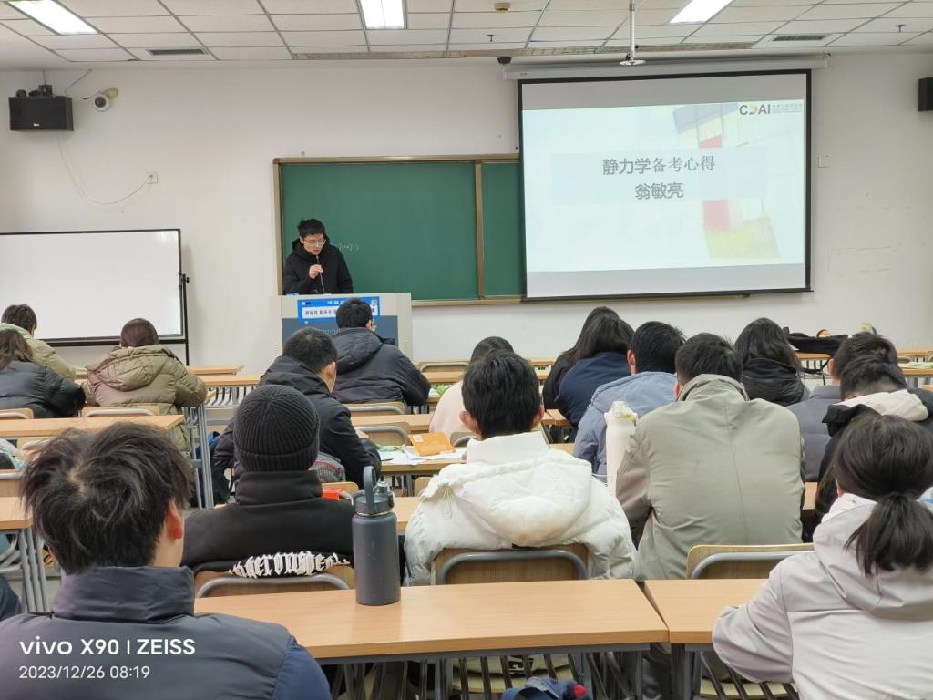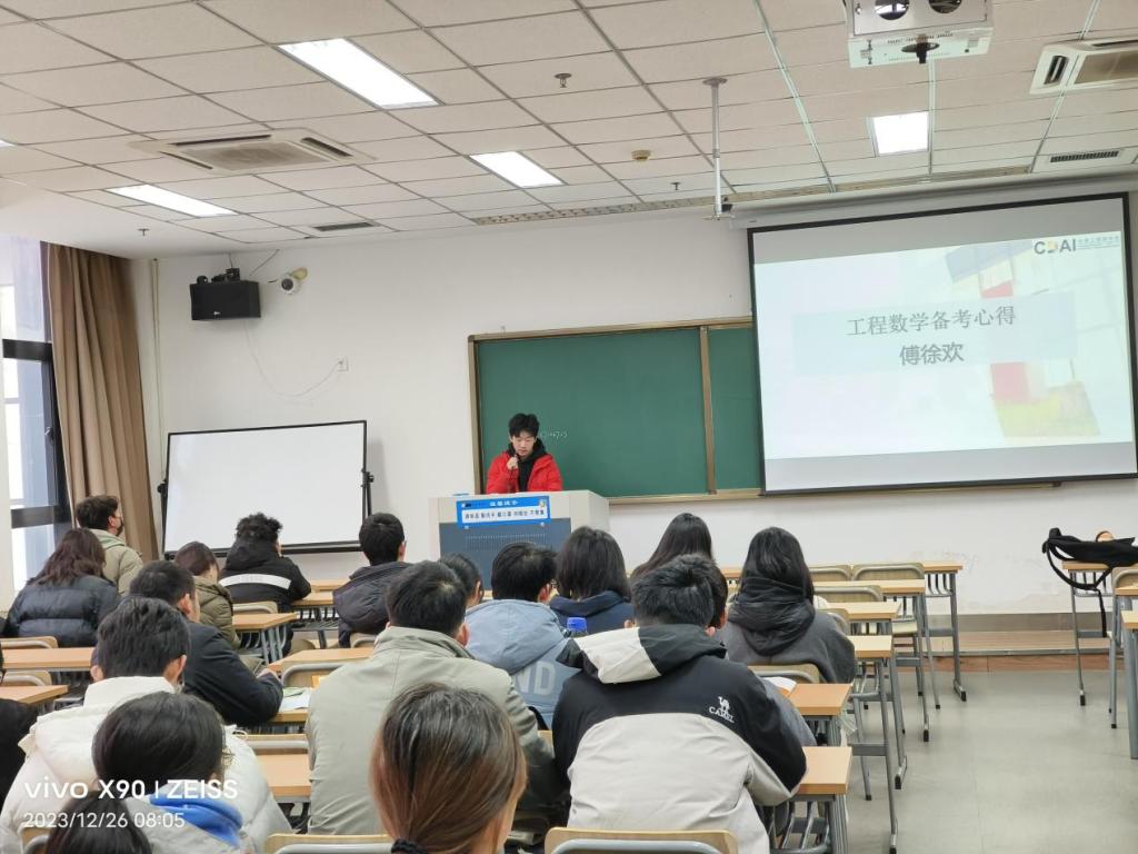 傅徐欢学长以“做题”为轴心,列举了工程数学“理解”“思路”“总结”“数量”的四个做题的要点,分享了视频自学、整理知识清单、通过例题强化公式和结论的运用等学习方法。童昕斌学姐通过举例为大家生动地展示了大学德语考试的流程与得分要点,并带来口试、听力、笔试中的不同复习技巧。王徐欢学长带来建筑构造备考心得,分别从笔试与口试为打击讲述建筑构造的应试技巧以及复习过程中可以做的准备。王雅琪学姐分别从cad考试难点、学习过程中的技巧为我们讲解了画法几何在各个方面的学习以及考试要领,列举了截交线和相贯线两个考试重点并强调“难题不慌”这一重要心态。翁敏亮学长讲解了静力学备考要点,通过例题的讲述强调了“做题”和“理解”的重要性,鼓励同学们找准自己的复习方法。最后学长学姐们分享了各自的联系方式,鼓励大家多多交流。