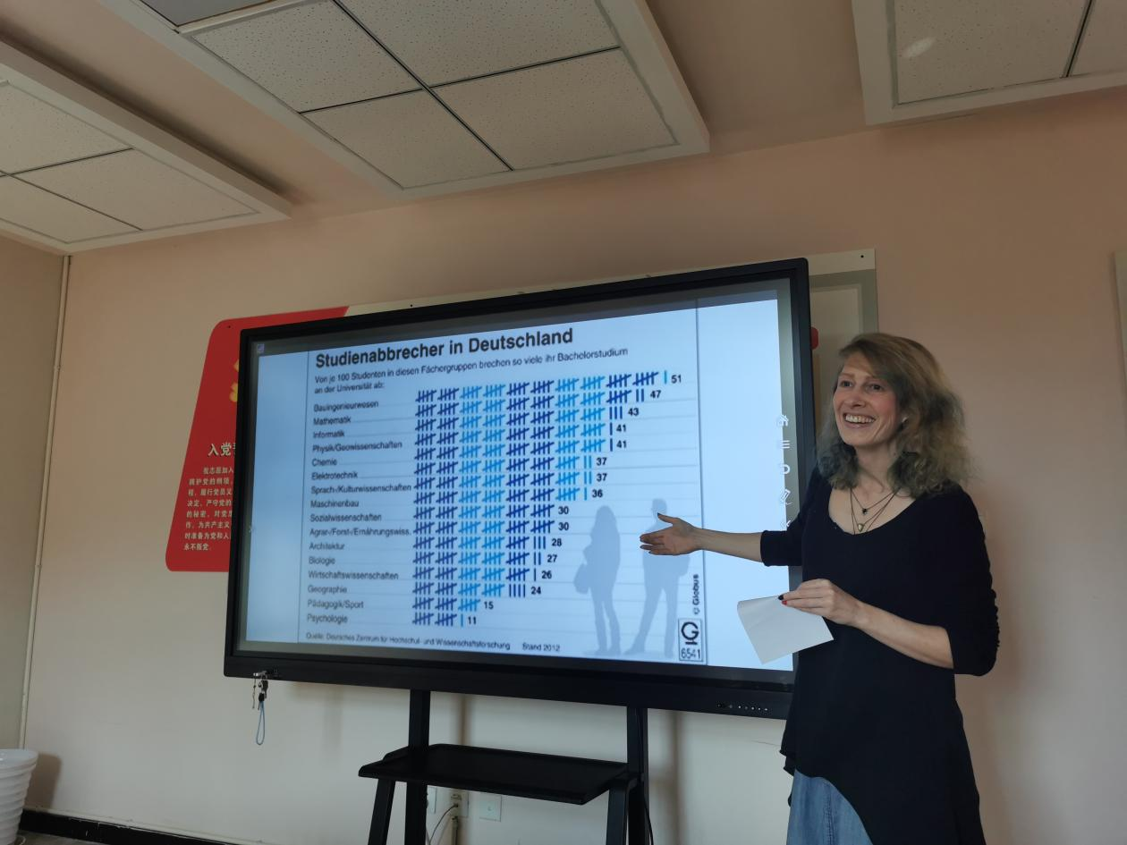 11月10月,“走向世界”辅导员工作室举办交流沙龙,成人视频 德语教师Mara Gröner做主题分享,来自学工、教学、教务各条线教职工参加。Mara为柏林自由大学硕士,歌德成人视频 认证德语教师,曾在德国柏林的多家语言成人视频 任教,来华之后曾就职于成都大学,2021年起在成人视频 工作。