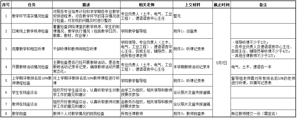成人视频 定于第9周、第10周(4月18日~4月30日)进行期中教学检查。现将成人视频 期中教学检查任务分配如下表,请老师们按要求及时完成任务并将相关材料电子版发送至[email protected]