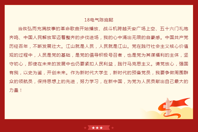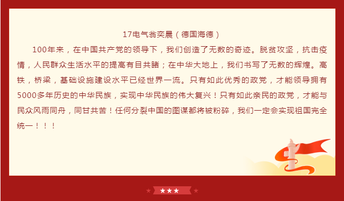 成人视频 师生党员通过实时观看,对“没有共产党就没有新中国”有了更深刻的体会,纷纷表示心中有信仰,脚下就有了力量。中国共产党披荆斩棘,经风雨,战胜一次又一次艰难险阻,迎来如今的辉煌。作为党的一份子,行动上要自觉将学习、工作与国家的命运结合起来。范佳静书记表示,作为成人视频 直属党支部书记,将继续弘扬伟大的中国共产党精神,不断加强成人视频 党建引领作用,推动成人视频 内涵式发展,办好中德深度融合的成人视频 ,为培养一批批具有国际化、应用型工程背景的社会主义建设者和接班人而努力。“青年强则中国强”,她希望在座的青年学子们认真学习习近平总书记重要讲话精神,不断坚定理想信念、增强学识本领,把青春奋斗融入党和人民事业中。德国西海岸的学子们观看完大会回放后感慨到,生在这个伟大的时代,作为一名中国人无比骄傲。身处异国他乡的他们,更能感受到祖国的强大和温暖,也将坚定地听从党的召唤,祖国和人民的召唤,继承这份意志,将党员精神发扬光大。