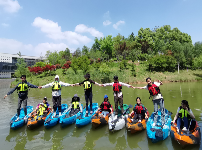 2023年4月20日,成人视频 工会组织成人视频教师们在风景优美的安吉校区开展了水上皮筏艇体验项目,由体育部贾浩程老师进行教学指导。
